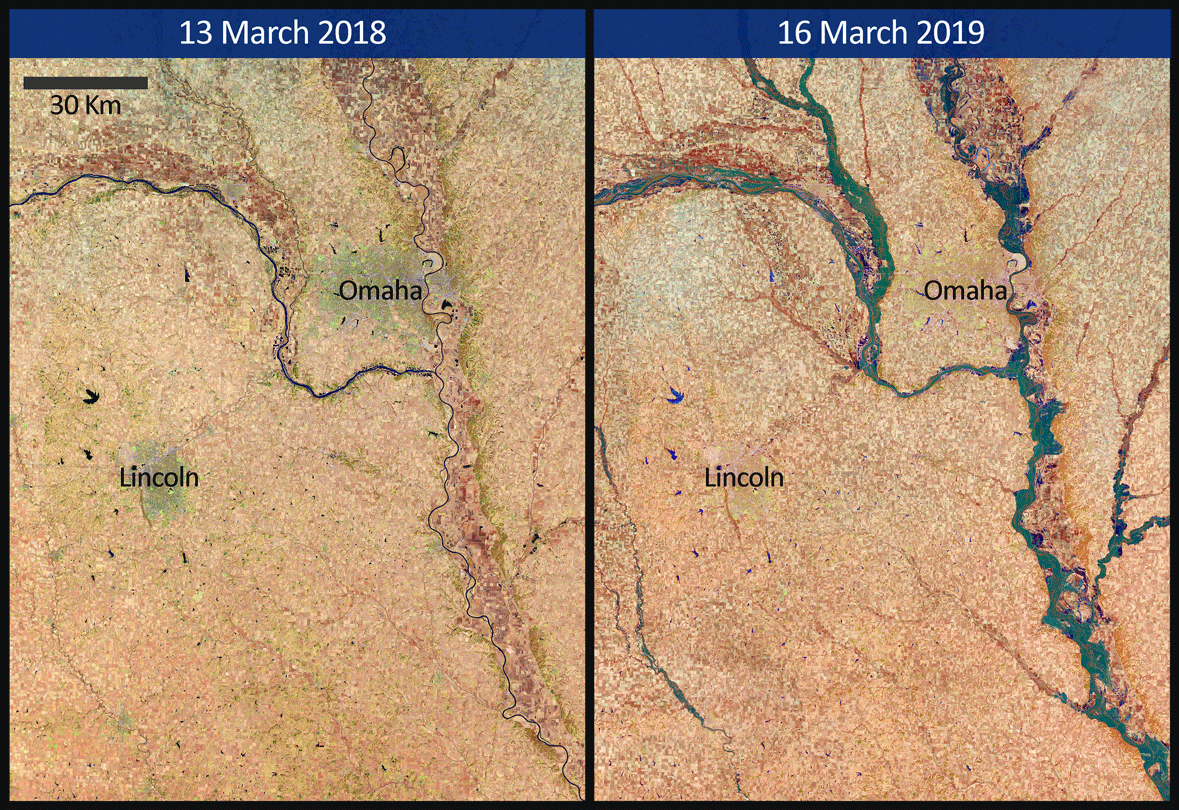 An animation of the Omaha area (Nebraska, USA) that shows spring flooding rendered first in a Landsat 8 Operational Land Imager (OLI) false color composite, and second by the Landsat Level-3 Dynamic Surface Water Extent (DSWE) product. (figure by Earth Resources Observation and Science (EROS) Center (2019)).