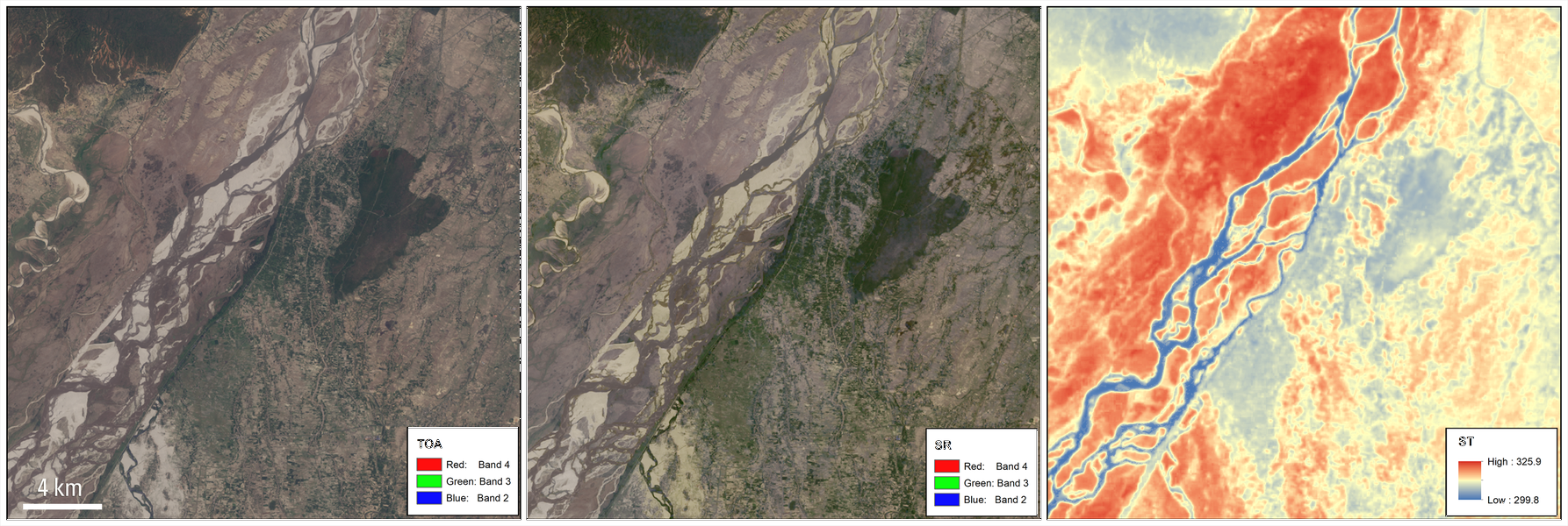 Landsat 8 Collection 2 products for an area over the Sapta Koshi River in Bairawa, Nepal (path 140 row 41) acquired on May 3, 2013. Left: Level-1 top of atmosphere reflectance (TOA) image. Center: Atmospherically corrected surface reflectance (SR) image. Right: Level-2 surface temperature (ST [K]) image (figure by M. A. Bouchard, USGS (2013)).