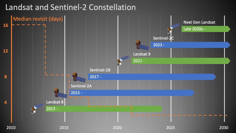 Timeline of the Landsat/Sentinel-2 Virtual Constellation, contributing to the Harmonized Landsat and Sentinel-2 (HLS) archive with consistent surface reflectance at improved temporal resolution (figure by HLS Science Team/NASA EarthData). See also this animation of the different satellites with orbits and data swaths.