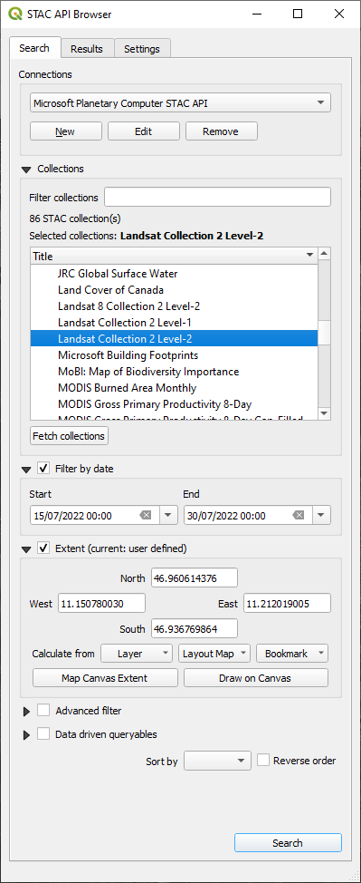 The goal of this excercise is learn how to search and load Landsat data of selected scenes from large archives of cloud providers to QGIS. Try to accomplish the following tasks using QGIS and the STAC API Plugin: