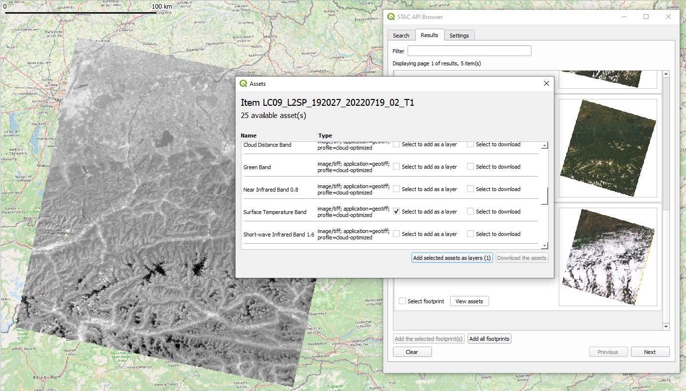 One asset (Surface Temperature Band) of the STAC item (Landsat 9 scene) found is loaded as a layer to the QGIS map canvas.