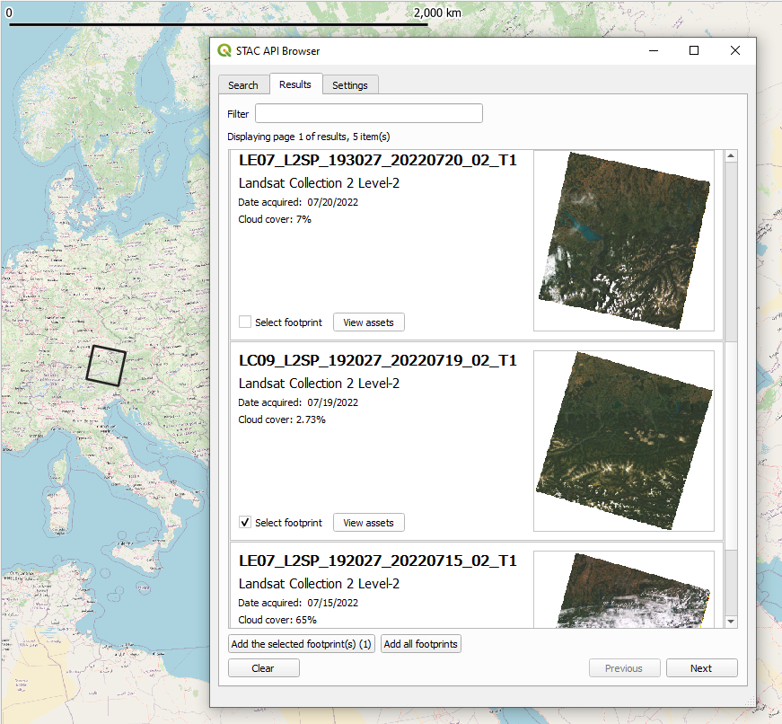 (Hint: AWS/EarthSearch and Microsoft Planetary Computer make their STAC APIs available without authentication (as of 03/2023)) - Select a scene for further use, preferably one with little cloud cover. Load the footprint of the scene to your map canvas (along with a background map, e.g. Open Street Map).