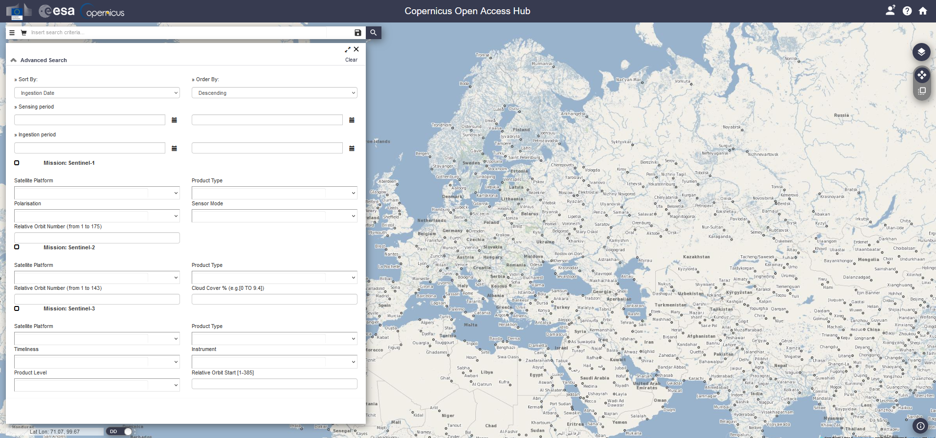 Browser-based graphical user interface of the Copernicus Open Accesss Hub, useful mainly for downloading one or a few scenes.