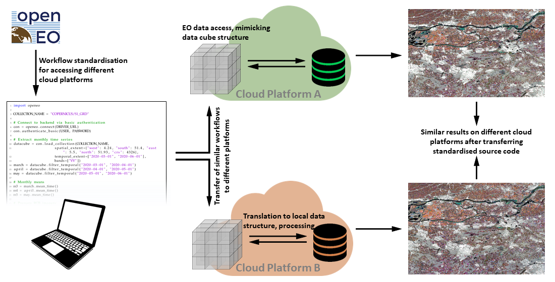 Another interesting initiative targeting large remote sensing time series with cloud computing and the data cube concept is openEO. This project develops an open application programming interface (API) that allows you to connect clients for R, Python and JavaScript to big Earth observation cloud back-ends in a simple and unified way. With this openEO API you can run a selection of defined processes on the cloud infrastructure. The processes available are depending on the back-end; they cover mostly data download, handling and basic processing steps (aggregations, resampling, filters, math, pixel operations, NDVI, ...). Currently, openEO features