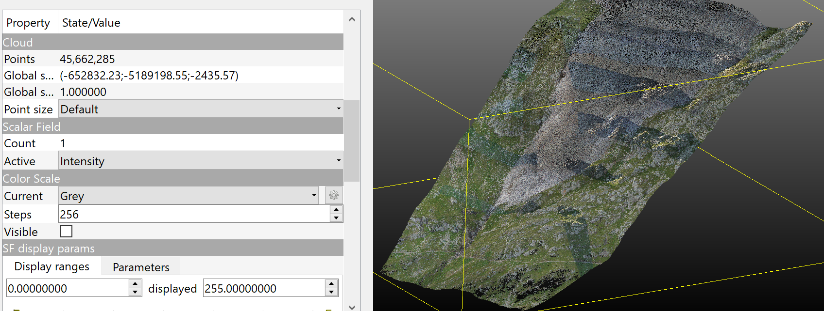 - How many attributes (scalar field in CloudCompare) and which does the point cloud have? Note that attributes were removed to reduce the data volume of the course, so you may miss some typical LiDAR attributes.
